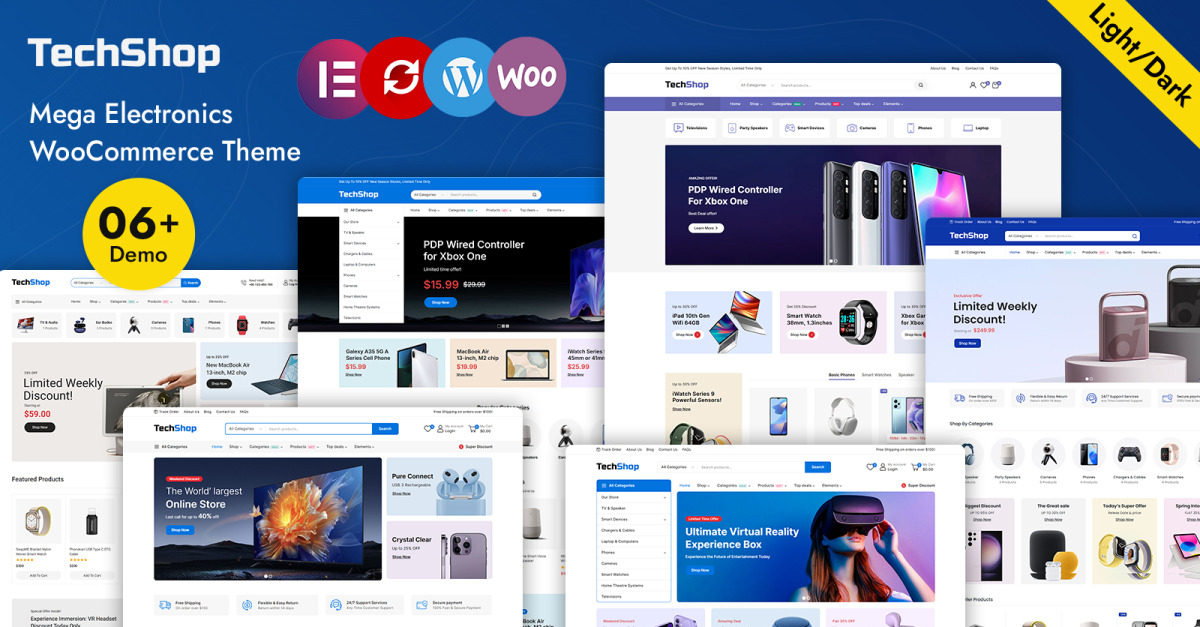 TechShop es un tema WooCommerce de WordPress potente y repleto de funciones, diseñado específicamente para tiendas de electrónica, gadgets y tecnología. Ya sea que vendas smartphones, portátiles, accesorios para videojuegos o dispositivos inteligentes para el hogar, TechShop te ofrece una plataforma elegante, moderna y de alto rendimiento para exhibir tus productos de forma eficaz.