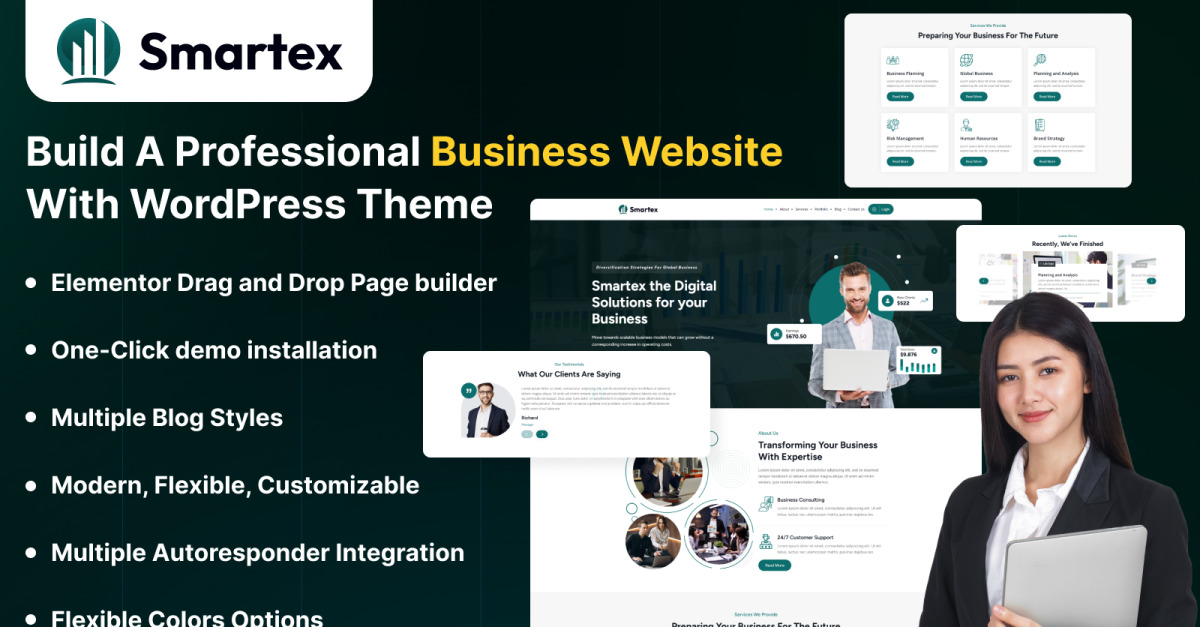 ¿Está buscando una solución para crear un sitio web impactante, elegante y moderno para su negocio de consultoría? ¡Su búsqueda termina aquí! El tema Smartex Business está diseñado para ayudarlo a crear un sitio web profesional para diversas industrias, incluidas las de consultoría, corporativas, soluciones comerciales, servicios de asesoría o cualquier otra organización. Con el complemento Slider Revolution, puede diseñar controles deslizantes y banners llamativos para mejorar el atractivo visual de su sitio web.