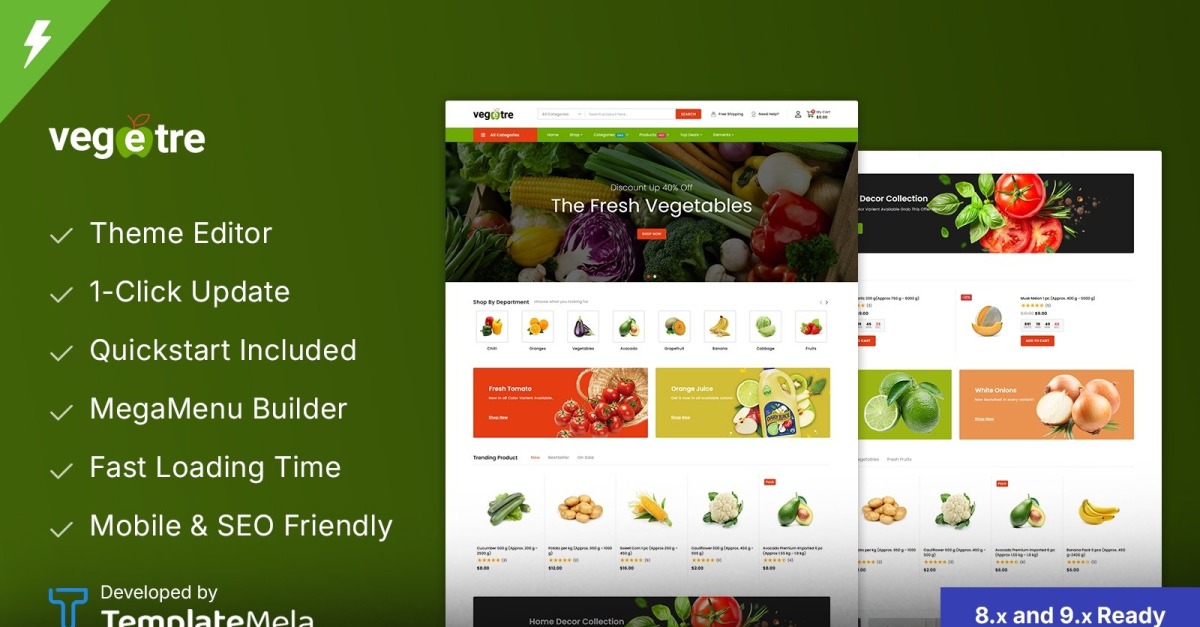Le thème Vegetre Prestashop est entièrement personnalisable et convient aux sites Web de commerce électronique de magasins polyvalents. Forfait Vegetre Prestashop Theme comprenant un clic (Quick-Start) pour obtenir une réplique de notre magasin de démonstration de thèmes sur le site Web de votre magasin avec le même contenu, les mêmes graphiques, les mêmes paramètres de thème et mises en page, etc. Le thème Vegetre Prestashop a un certain nombre de fonctionnalités de fonctionnement de un modèle moderne à usages multiples dans la création d'un site Web. Thème Vegetre prenant en charge la dernière version de Prestashop.
