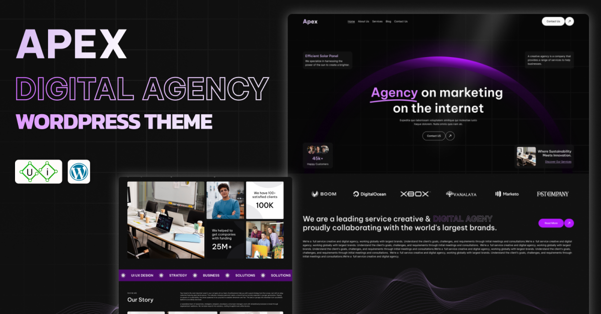 Apex est un thème WordPress créatif, spécialement conçu pour les agences digitales, les portfolios créatifs et les entreprises qui souhaitent marquer les esprits en ligne. Avec son design épuré et moderne, ce thème WordPress pour portfolio créatif vous permet de présenter votre travail, vos services et votre équipe de manière visuellement percutante. Que vous soyez freelance ou agence établie, Apex garantit un site web professionnel, fonctionnel et facile à naviguer.