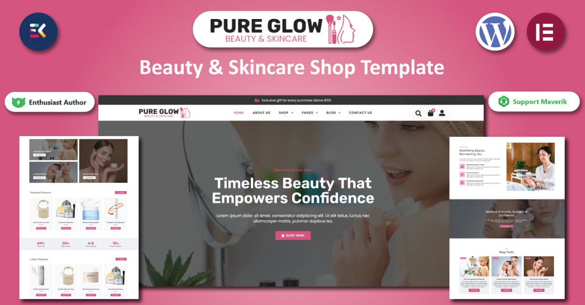Pure Glow - Szépségápolási és bőrápolási üzlet WooCommerce Elementor sablon