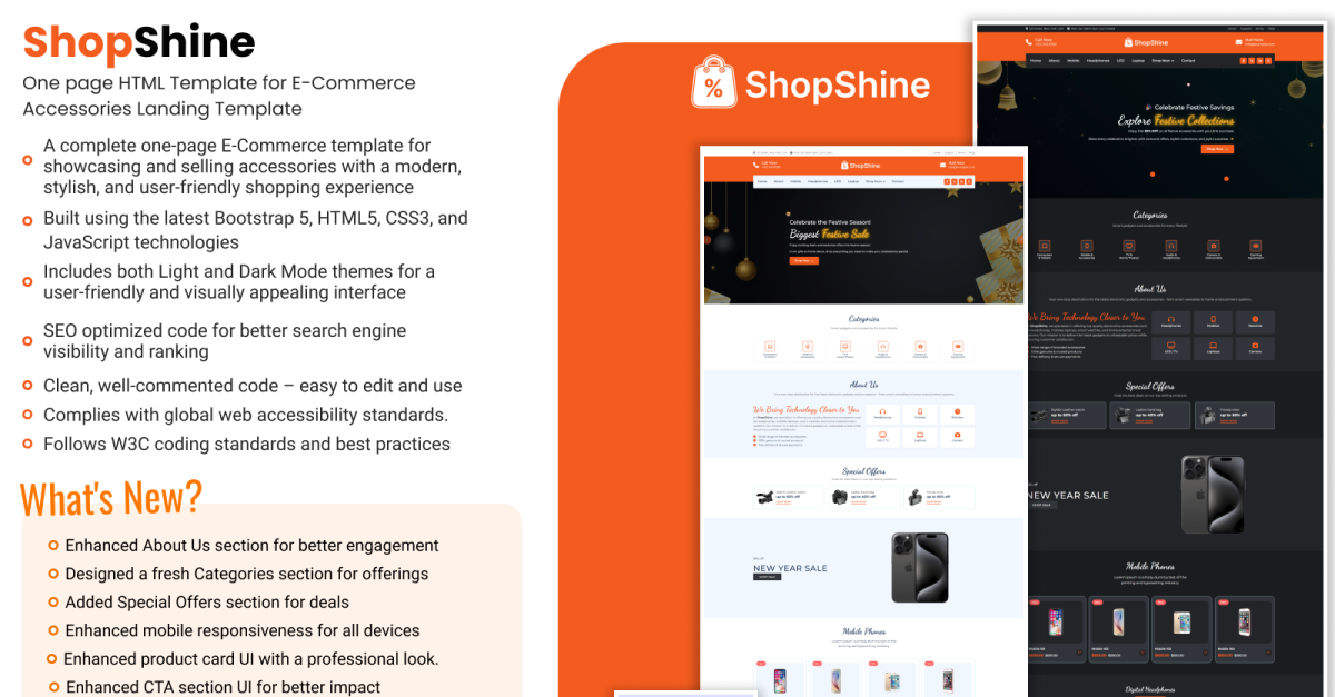 ShopShine è un modello di landing page e-commerce elegante e ad alta conversione, pensato per i negozi online di accessori elettronici. Realizzato con il framework Bootstrap 5 insieme a HTML5, CSS3 e JavaScript, ShopShine combina un design moderno con una programmazione orientata alle prestazioni per offrire un'esperienza di acquisto eccezionale. Con temi chiari e scuri, una navigazione a scorrimento fluido, sezioni incentrate sui prodotti e slider interattivi, ShopShine ti consente di presentare gadget come cellulari, laptop, cuffie, smartwatch e sistemi di intrattenimento a LED con stile. Che tu stia organizzando una vendita lampo, presentando un nuovo prodotto o promuovendo offerte stagionali, ShopShine ti aiuta a massimizzare le conversioni mantenendo il tuo brand moderno e intuitivo.