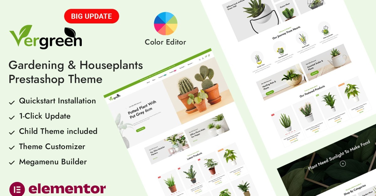 Vergreen – Potted Plant Store, il tema responsivo PrestaShop, è un tema e-commerce fresco, elegante e ispirato alla natura, progettato appositamente per vivai, venditori di piante da interno, negozi di giardinaggio, boutique di arredamento e marchi di lifestyle eco-friendly. Con la sua palette di colori tenui, la tipografia pulita e il layout spazioso, Vergreen crea un'atmosfera di shopping rilassante che mette in risalto le varietà di piante e gli arredi botanici.