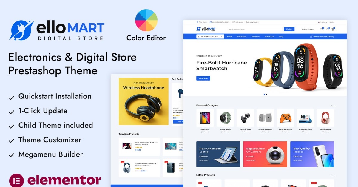Sviluppato con Elementor Page Builder , Ellomart consente di personalizzare facilmente i layout della homepage, le sezioni promozionali, le vetrine dei prodotti e i banner con semplici comandi drag-and-drop. Che si tratti di presentare smartphone, smartwatch, altoparlanti, dispositivi di gioco o dispositivi tecnologici per la casa, il tema garantisce che ogni articolo sia ben organizzato e facile da consultare.