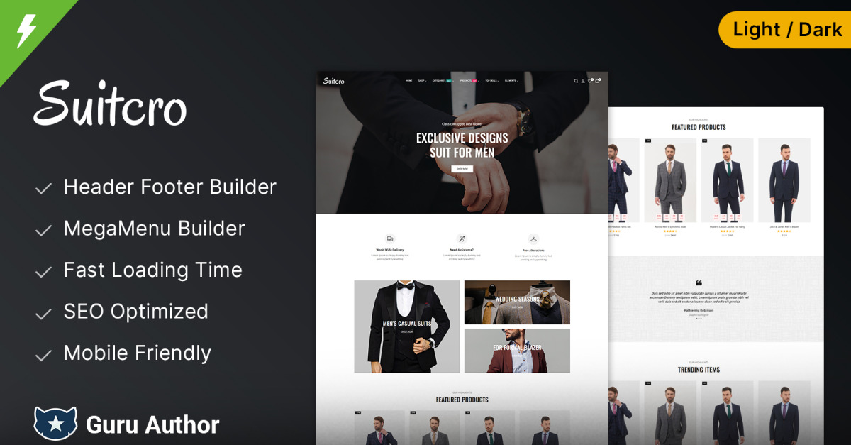 Con il suo design elegante, le funzionalità avanzate e la facile personalizzazione , Suitcro è la scelta perfetta per i rivenditori di moda maschile e le boutique per matrimoni. Che tu stia avviando una nuova attività o rinnovando un negozio esistente, questo tema garantisce un'esperienza di acquisto fluida e visivamente accattivante. Scarica Suitcro oggi stesso e ridefinisci la moda maschile online!
