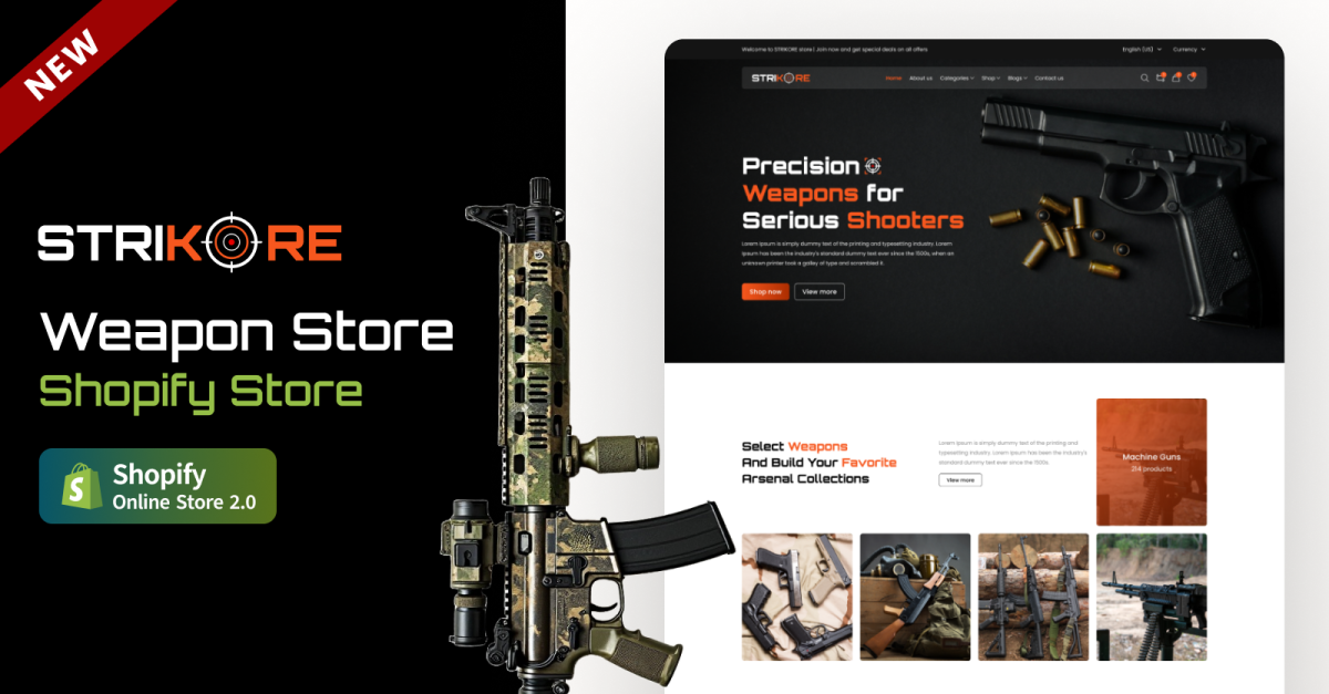 Strikore – Gun Shop 2.0 Shopify Theme is een gedurfd, modern en volledig responsief Shopify-thema, speciaal ontwikkeld voor wapenwinkels, winkels in jachtuitrusting, retailers van tactische uitrusting en merken voor outdoor survival. Strikore is ontworpen met precisie en prestaties in gedachten en biedt een professionele winkelomgeving die uw producten maximaal in de spotlight zet en tegelijkertijd een soepele, veilige en aantrekkelijke winkelervaring voor uw klanten garandeert.