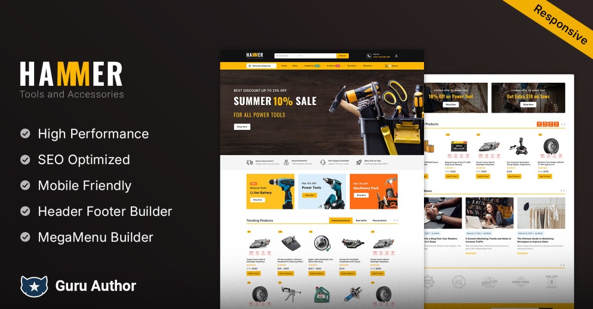 Hammer - Mega Tool Elementor WooCommerce-thema ontworpen voor auto-onderdelen en auto-onderdelen, hardware en onderdelen, auto's en accessoires, gereedschapskist- en boormachines en multifunctionele winkels. Bovendien is het eenvoudig aan te passen aan uw wensen, terwijl het een strak en mega-uiterlijk behoudt. Deze winkel is een zeer geschikt thema voor verkopers die hun producten en merken aan een zo breed mogelijk publiek willen verkopen. Het is een krachtige SEO-code die ervoor zorgt dat uw online winkel bovenaan de zoekresultaten komt te staan en dat uw producten ook op de eerste pagina terechtkomen.
