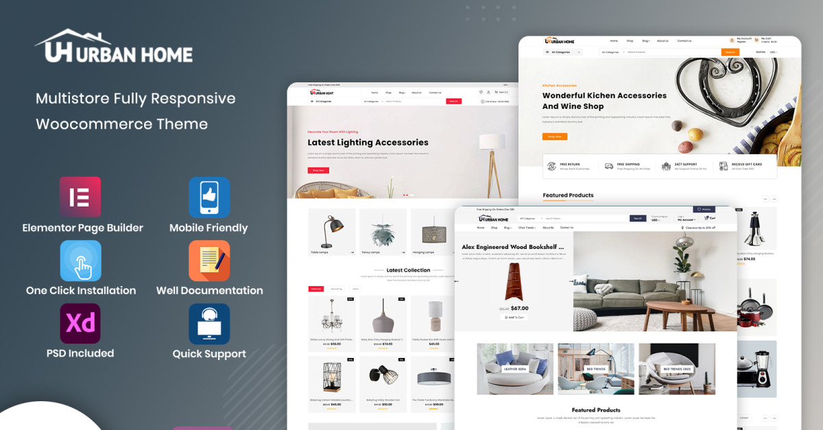 Urbanhome is een schoon, uitstekend, prachtig, multifunctioneel element- of woocommerce-responsief thema met meerdere lay-outs. In dit thema krijg je drie verschillende lay-outs, zoals huishoudelijke apparaten, lichte decoraties en een meubelwinkel. UrbanHome wordt geleverd met meerdere lay-outs voor multifunctioneel gebruik, voor één prijs krijg je veel keuzes om een website te maken met verschillende ontwerplay-outs, alle lay-outs zijn ontworpen met een specifiek doel, dus ongeacht het compromis in ontwerp. Ook gemiddelde prijs en de beste functionaliteit. er zijn veel kenmerken en voordelen van het stadshuis . maak uw eigen website in een paar klikken met drag-and-drop paginabuilder, ongeacht de codering, snelle ondersteuning door ons team, volledig responsief ontwerp en past gemakkelijk in alle schermen. hier zijn enkele voordelen en kenmerken van UrbanHome, zoals een volledig responsief ontwerp, demo-import met één klik, inclusief PSD- of XD-bestanden, eenvoudig aanpasbaar, contactformulier 7, SEO-optimalisatie, elementor-kits, ondersteunde plug-in van derden, ondersteuning voor meerdere valuta, Elementor Page Builder , e-mailabonnement, ondersteund met de nieuwste versie, meta slider, reduxe framework, woocommerce ready, ajax functies (toevoegen aan winkelwagen, verlanglijst, vergelijken en snelle weergave), YITH, carrouselproducten, product zoom, SEO ready, Mailchimp, ap megamenu, Google Analytics, drag-and-drop-functies, pop-upnieuwsbrief, voorbeelddemogegevens inbegrepen, metselwerkblogsysteem, optie voor klantrecensies, productcommentaar, enz.