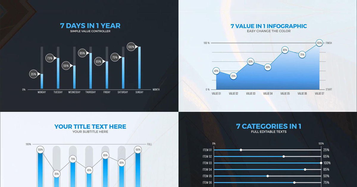 7 wartości w 1 wykresach infografiki — szablon After Effects