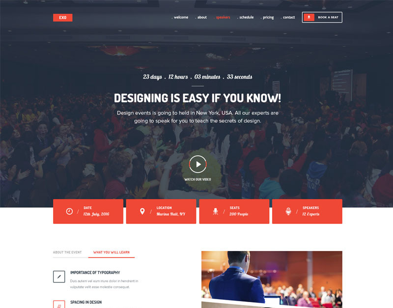 EXO to profesjonalny szablon konferencji i wydarzeń. Ten szablon HTML został specjalnie zaprojektowany dla stron internetowych firm związanych z konferencjami, spotkaniami, seminariami i wydarzeniami. Zawiera również twitter bootstrap 3, Video Popup, Countre, Beautiful Tab, Speakers, Gallery i wiele więcej.