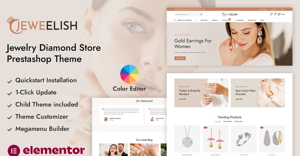 Dzięki intuicyjnemu kreatorowi stron Elementor Page Builder , Jeweelish umożliwia łatwą personalizację za pomocą prostych elementów „przeciągnij i upuść”. Możesz łatwo dostosować bloki treści, banery, slidery, kolekcje i sekcje promocyjne bez konieczności pisania ani jednej linijki kodu. Wbudowany moduł personalizacji motywu oferuje opcje stylizacji w czasie rzeczywistym dla kolorów, czcionek i ustawień układu, aby idealnie dopasować wygląd sklepu do charakteru Twojej marki.