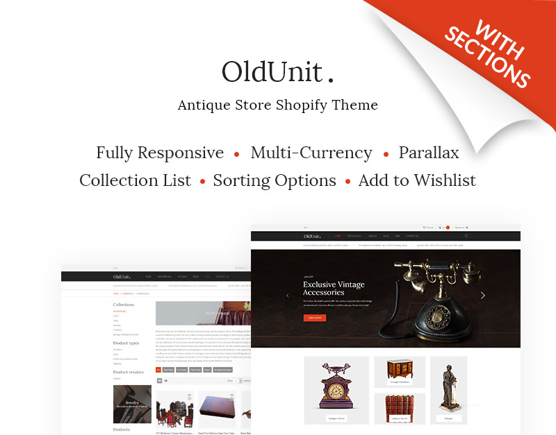 OldUnit to motyw Shopify sklepu z antykami, który jest dostarczany z zestawem narzędzi Visual Constructor z interfejsem „przeciągnij i upuść”. Zawiera dziesiątki różnych elementów. Dzięki niemu możesz ręcznie zbudować indywidualne układy stron i tym samym stworzyć unikalny projekt dla swojego sklepu internetowego. Jeśli chcesz, możesz tworzyć specjalne strony. Pakiet motywu zawiera zestaw obrazów i ilustracji. Podczas opracowywania motywu braliśmy pod uwagę opinię zwykłych użytkowników, którzy brali udział w jego testowaniu. Ponadto motyw ma wysoki poziom łatwości użytkowania i szybkości na urządzeniach mobilnych. Funkcjonalność sieci społecznościowej jest zintegrowana z motywem w postaci przycisków społecznościowych.