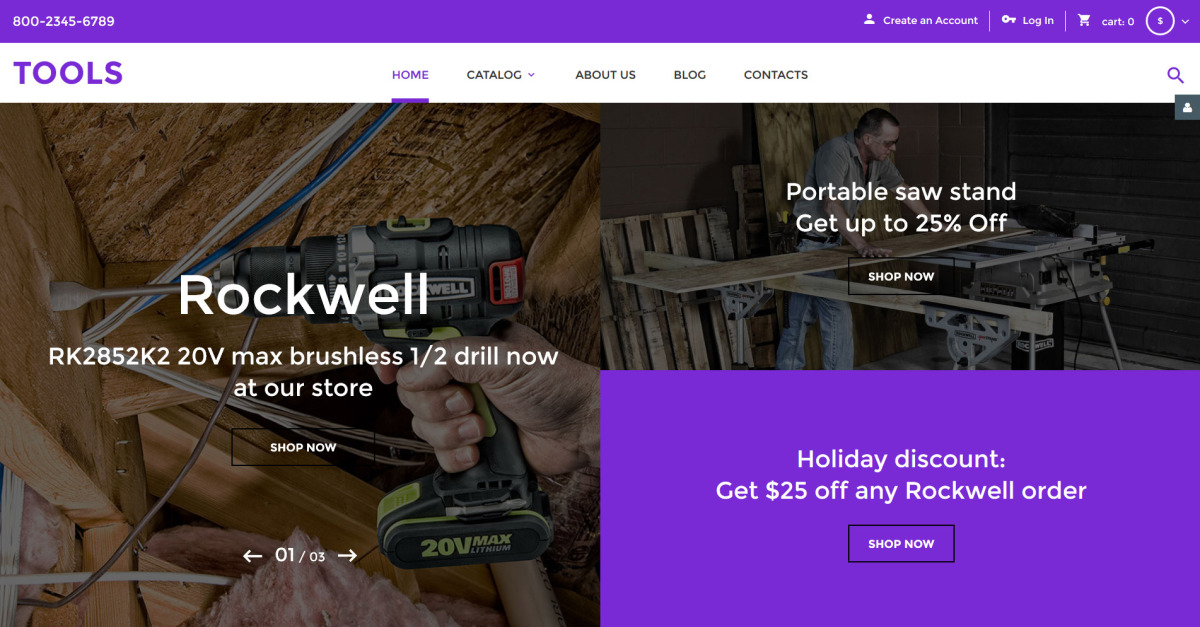 Tools to najwyższej klasy szablon VirtueMart, który został opracowany specjalnie dla witryn eCommerce zajmujących się usługami konserwacyjnymi, naprawami domów i usługami sprzątania. Dzięki niezwykłej fioletowej palecie ten szablon z pewnością wyróżni Twój sklep internetowy z tłumu. Narzędzia oferują czystą, płaską konstrukcję, efekty przezroczystości i zestaw ikon konturów specyficznych dla danego tematu. Funkcje oferowane przez ten szablon obejmują wbudowaną mapę Google, przyciski duchów i duży suwak na całej stronie, który pomoże Ci skuteczniej sprzedawać najlepsze produkty i usługi. Ten szablon VirtueMart jest w pełni responsywny i ma wiele możliwości zbudowania sklepu internetowego, który wygląda idealnie zarówno na komputerach stacjonarnych, jak i urządzeniach mobilnych.