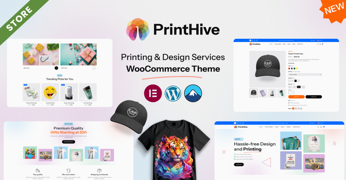 Zbudowany w oparciu o WooCommerce i Elementor, Print Hive łączy elastyczny design z rozbudowaną funkcjonalnością eCommerce. Motyw oferuje układy zorientowane na produkty, zaawansowane filtrowanie i zoptymalizowany proces płatności, ułatwiając klientom przeglądanie, personalizację i kupowanie produktów do druku.