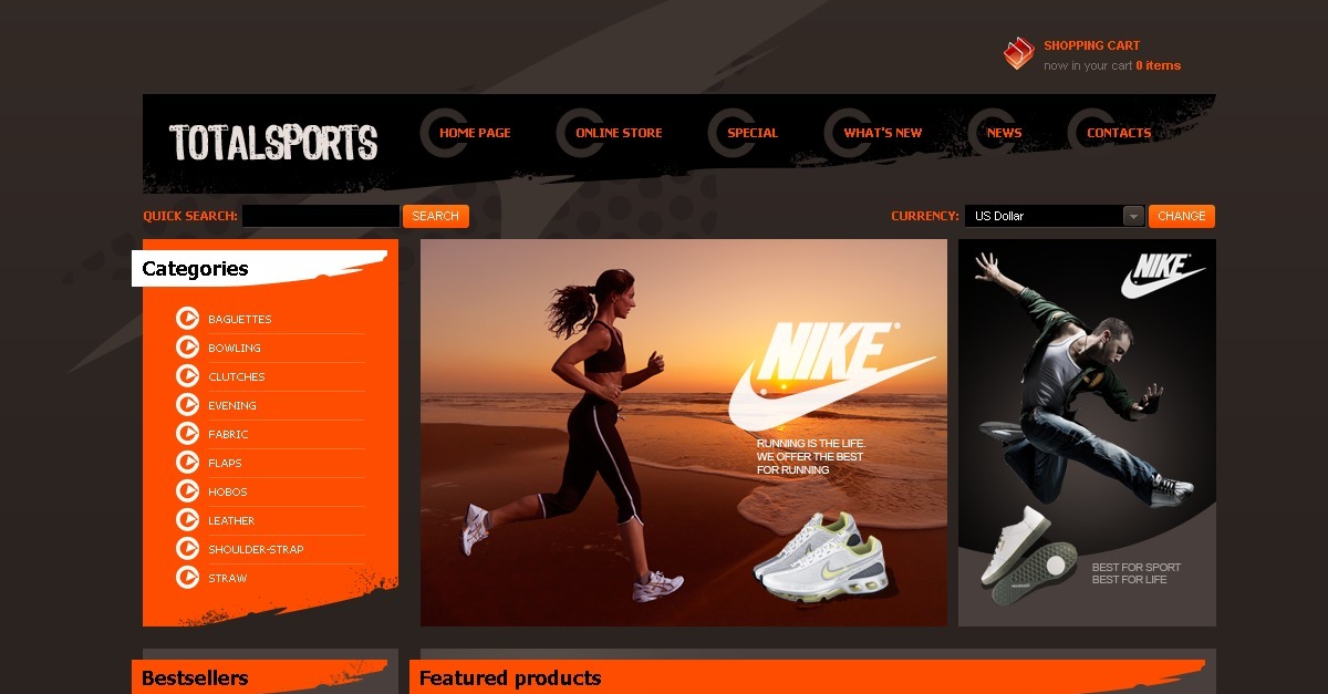 Se você precisa de uma loja online com design interessante, este tema se encaixa perfeitamente no conceito. O layout grunge e os elementos vermelho-sangue tornam a loja memorável. A barra do menu principal tem um efeito de foco incomum. Banners promovem roupas esportivas da marca. Os links das categorias e dos mais vendidos são colocados na barra lateral esquerda. Os produtos em destaque são apresentados em três colunas. Os botões Adicionar ao carrinho e Detalhes são fornecidos para cada item.