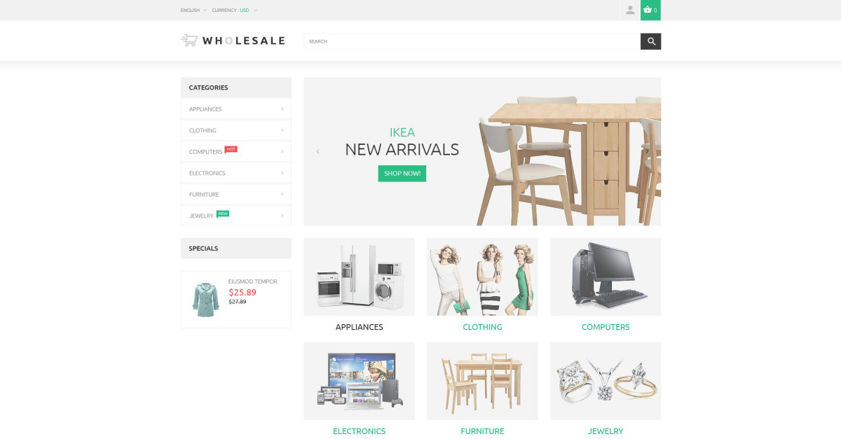 Este é o design do PrestaShop do diretório de atacado com o instalador de dados de amostra