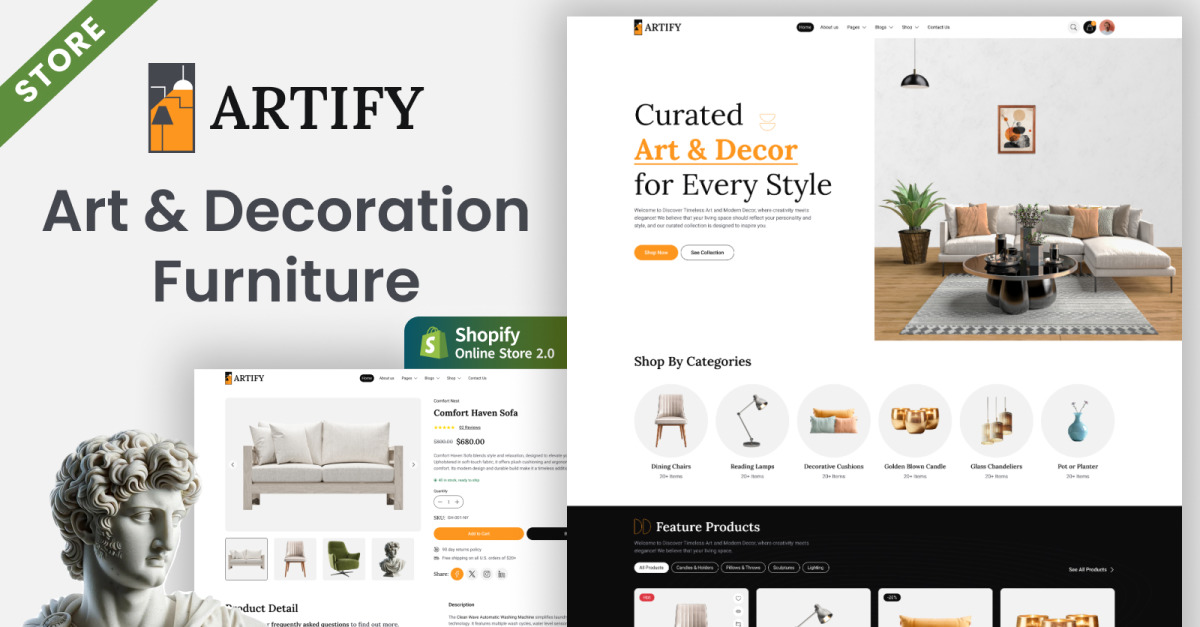 Artify - Furniture & Home Decor Shopify Website Theme é uma solução de e-commerce premium adaptada às necessidades exclusivas de negócios de móveis e decoração para casa. Projetado com elegância e usabilidade em mente, este tema é ideal para exibir coleções de móveis, produtos de design de interiores e itens decorativos. Seja você uma pequena marca de artesãos ou um grande varejista, o tema Artify Furniture Shopify oferece as ferramentas e a flexibilidade de que você precisa para criar uma loja online cativante que se alinhe com sua visão.
