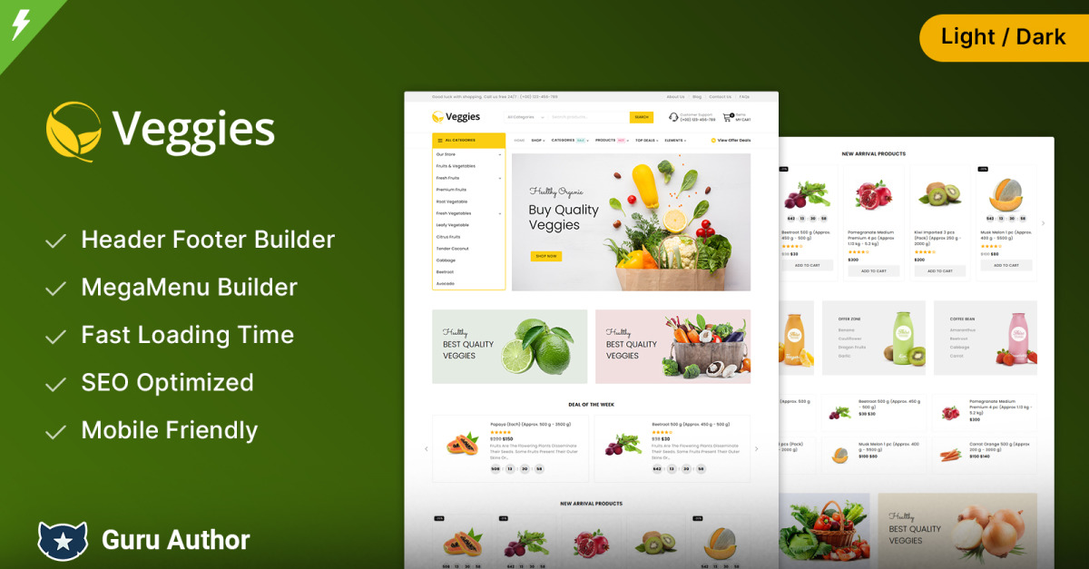 Desenvolvido para desempenho, o Veggies garante uma experiência de compra fluida e envolvente. A importação de demonstração com um clique permite que você configure sua loja em minutos. O catálogo avançado de produtos exibe frutas, vegetais, mantimentos e temperos de forma elegante, enquanto o megamenu mantém a navegação limpa e organizada. O recurso de visualização rápida permite que os clientes naveguem pelos detalhes dos produtos sem recarregar a página, e a funcionalidade de lista de desejos incentiva visitas recorrentes e conversões mais altas.