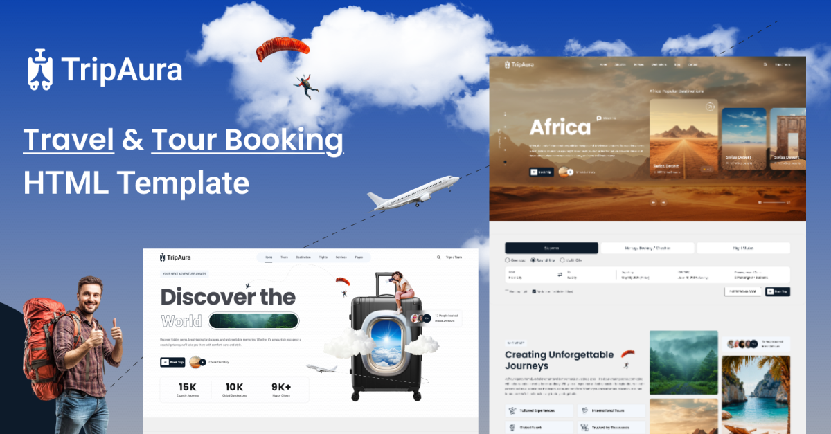 Tripaura – Modelo HTML para Reservas de Voos e Passeios é um modelo de viagem poderoso, moderno e responsivo, desenvolvido para operadores turísticos, agências de viagens, sites de reservas de passagens aéreas e empresas de aventura. Projetado com foco na experiência do usuário, ele ajuda empresas do setor de viagens a apresentar destinos, gerenciar reservas e promover pacotes turísticos de forma envolvente e profissional.