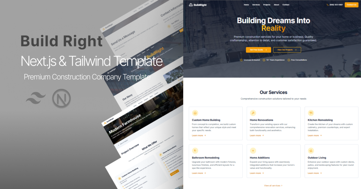 Поднимите свой строительный бизнес с помощью BuildRight, лучшего премиум-шаблона, разработанного специально для строительных компаний. Созданный на основе мощного фреймворка Next.js и оформленный с помощью Tailwind CSS, BuildRight предлагает современный, адаптивный дизайн, отвечающий разнообразным потребностям строительной отрасли. Независимо от того, являетесь ли вы подрядчиком, архитектором или строителем, этот шаблон создан, чтобы помочь вам эффективно продемонстрировать свои услуги и привлечь нужных клиентов.