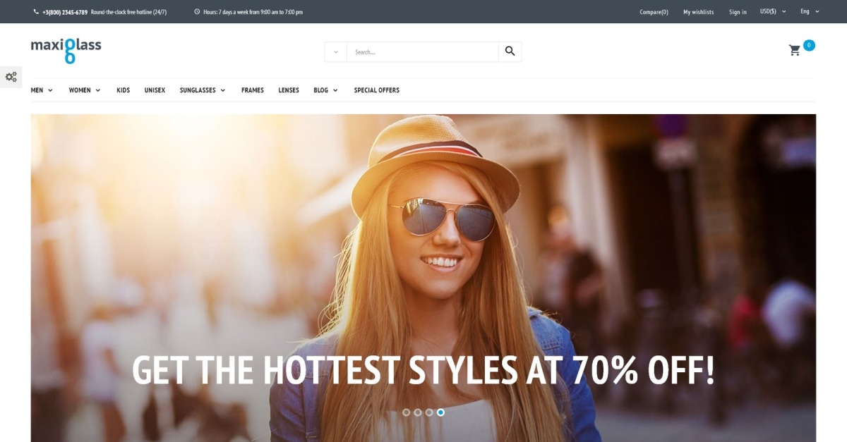 Maxiglass — адаптивная тема для интернет-магазинов оптики, оптометрии и ухода за глазами. Команда PrestaShop внедрила в тему множество модулей, которые предоставляют вам неограниченные возможности для оптимизации интернет-магазина. Запустите живую демо-версию!