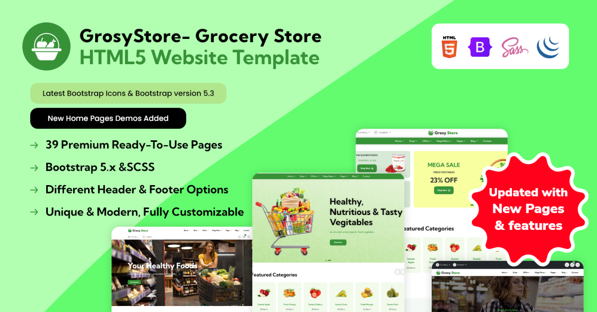 Grossy Store — это шаблон веб-сайта для продуктового интернет-магазина, специально разработанный для таких интернет-магазинов, как продуктовые магазины, супермаркеты, магазины напитков, овощей, фруктов, мороженого, мегамаркеты и многие другие. Это очень простой шаблон для использования красивых изображений продуктов с целью создания уникальной индивидуальности для вашего клиента. Очень легко отправлять такие товары, как овощи и фрукты, сухофрукты, онлайн из продуктовых магазинов. Он адаптивен для мобильных устройств и удобен для планшетов. Хорошо работающий шаблон веб-сайта, который спроектирован и разработан с учетом современных технологий. В шаблоне веб-сайта HTML вы получите все необходимые элементы, из которых можно создать веб-сайт, выполнив очень простые шаги.