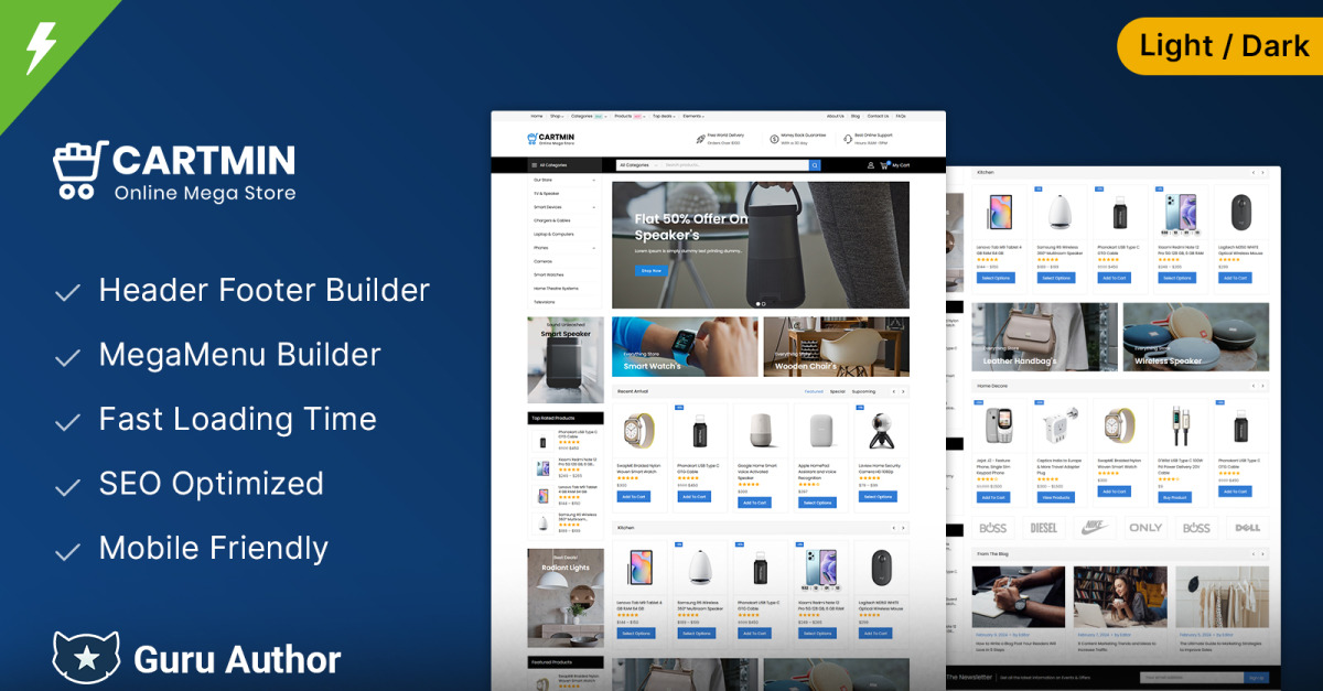 Cartmin — это высокопроизводительная тема WooCommerce, разработанная для мегамагазинов электроники , мобильных магазинов и многоцелевых розничных предприятий . Продаете ли вы новейшие гаджеты, бытовую технику или технические аксессуары, Cartmin сочетает в себе современный дизайн с мощным функционалом электронной коммерции, помогая вам создать выдающийся интернет-магазин, который конвертируется.