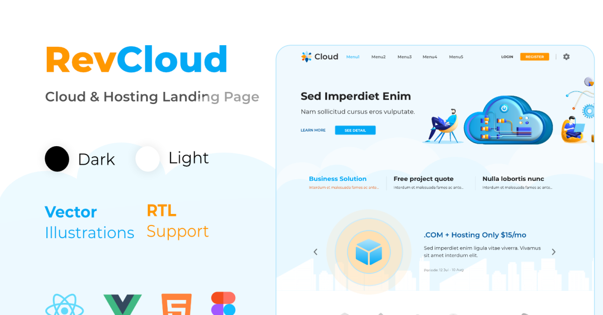 RevCloud - Cloud Hosting HTML React Vue och Figma Landing Page Mall