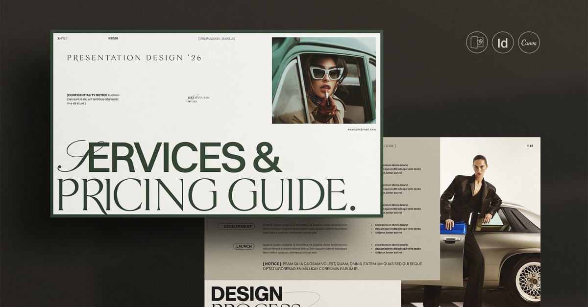 Hizmetler ve Fiyatlandırma Rehberi Sunumu , Adobe InDesign, PowerPoint ve CANVA için 20 adet tamamen özelleştirilebilir düzen tasarım şablonudur.