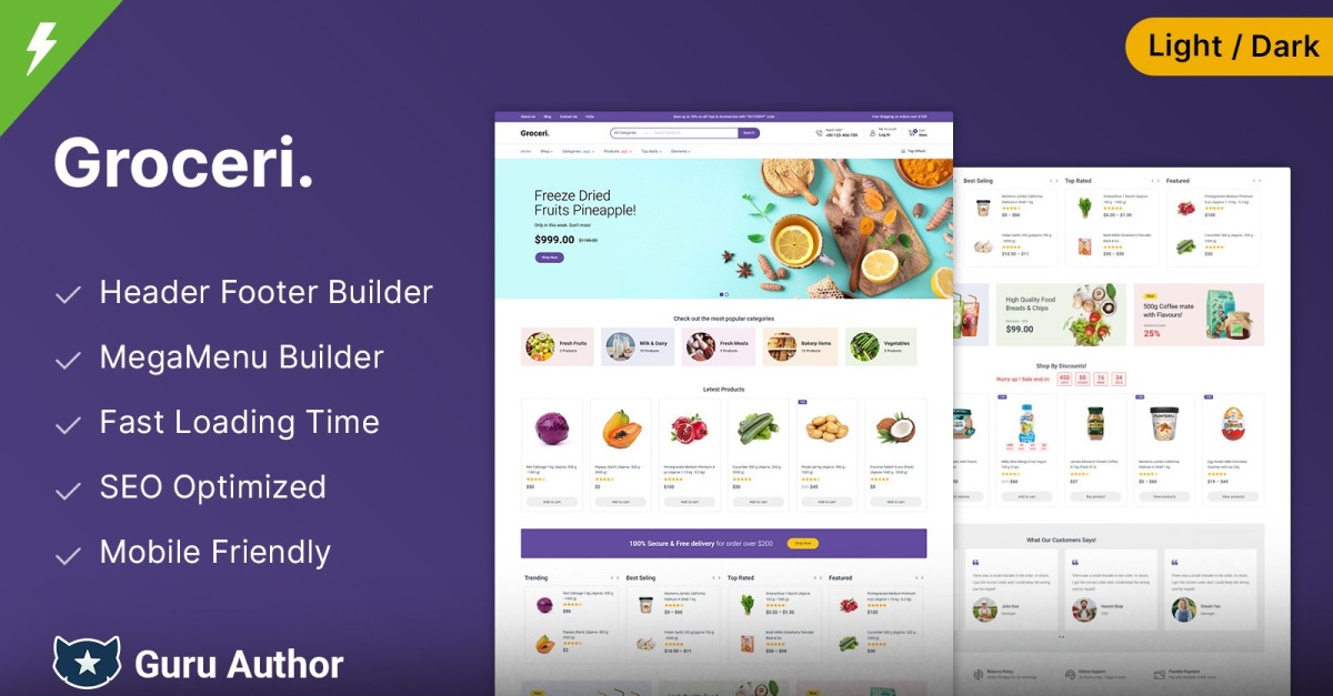 Groceri, marketler, organik gıda dükkanları, meyve ve sebze pazarları ve çiftlikten taze ürün satıcıları için özel olarak tasarlanmış, güzel bir WooCommerce temasıdır. Elementor ile oluşturulmuş, sorunsuz bir sürükle ve bırak deneyimi sunarak kodlama becerileri olmadan görsel olarak çarpıcı ve oldukça işlevsel bir mağaza oluşturmanıza olanak tanır. İster bir süpermarket, ister organik bir çiftlik mağazası veya taze ürün teslimat hizmeti işletiyor olun, Groceri ürünlerinizi sergilemek ve satışları artırmak için mükemmel bir platform sağlar.