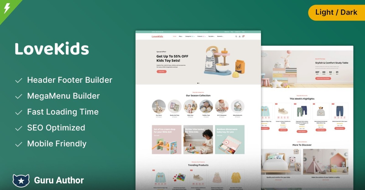 TemplateMela tarafından oluşturulan Lovekids , çocuk ürünleri ve bebek odaklı işletmeler için özenle tasarlanmış, büyüleyici ve eğlenceli bir WooCommerce Elementor temasıdır. İster çocuk oyuncak mağazası, ister çocuk giyim butiği, bebek mağazası veya hatta bir bebek bakıcılığı hizmeti işletiyor olun, Lovekids çocukluğun sevincini yakalayan karşı konulamaz bir görünüm ve his sunar. [Oyuncak Mağazası Şablonları], [Moda Mağazası Şablonları], [Bebek Mağazası Şablonları], [Çocuk Modası], [Bebek Bakıcısı Şablonları] ve [Yeni Doğan Şablonları] nişleri için mükemmel şekilde uygun olan bu tema, çevrimiçi mağazanızı hem ebeveynler hem de hediye verenler için keyifli bir deneyime dönüştürür.