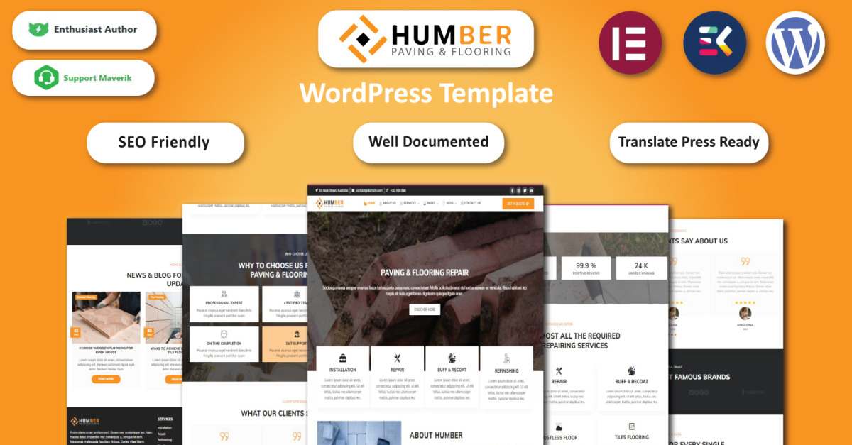 Humber, kaldırım ve döşeme hizmeti web sitesi için bir WordPress temasıdır. Bu tema paketi, kaldırım / döşeme kurulumu , ticari zemin kaplaması, evcil hayvan dostu zemin kaplaması, çevre dostu zemin kaplaması, zemin kaplamasının çıkarılması ve zemin onarımı gibi profesyonel hizmetler sunan web siteleri için uygundur. Zarif, temiz, modern ve profesyonel gerekli tüm şablonları içerir. Bu Elementor temasıyla asfaltlama, inşaat ve döşeme hizmetleriyle ilgili herhangi bir web sitesini hızlı bir şekilde tasarlayabilirsiniz.