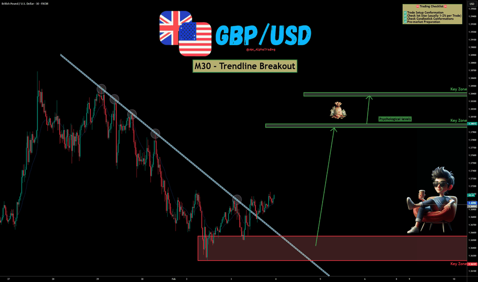 GBP/USD – Trendline Breakout | Bullish Reversal SetupGBP/USD has shown a clear breakout above a well-respected descending trendline on the M30 timeframe, hinting at a potential shift from bearish to bullish momentum. Price action is reacting strongly from a key demand zone, increasing the probability of continuation to the upside. OANDA:GBPUSD