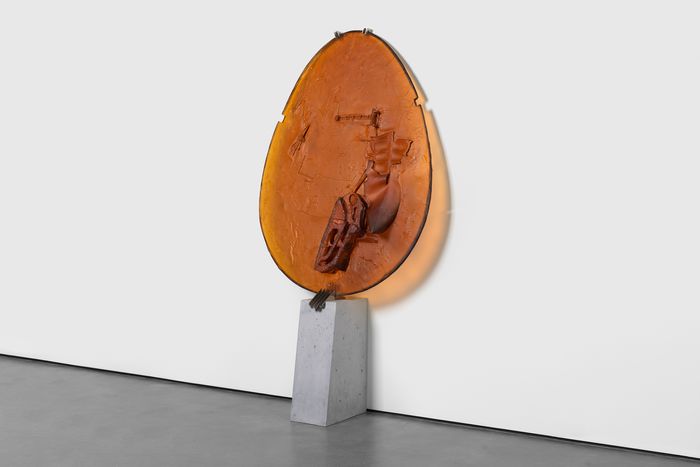 The various lineages of Ursuța’s work are unmistakable. She has taken the oval format from Lucio Fontana’s egg-shaped paintings, and, like Fontana, she shares the urge to turn the oval into a portal, a cosmic slit — but while Fontana gestured toward infinity, Ursuța seems overwhelmed by historical fatigue. Like H.R. Giger, Ursuța engineers an anti-heroic vocabulary in which ornament functions as wound and polished surfaces feel diseased. Like Matthew Barney, she treats myth as theater, each object a prop in a play without a script. And like her Zwirner stablemate Huma Bhabha, she builds hulking figures out of rubble and refuse — monumental yet grotesque and alive. The difference is that Ursuța’s slabs insist on fragility. The glass might shatter.