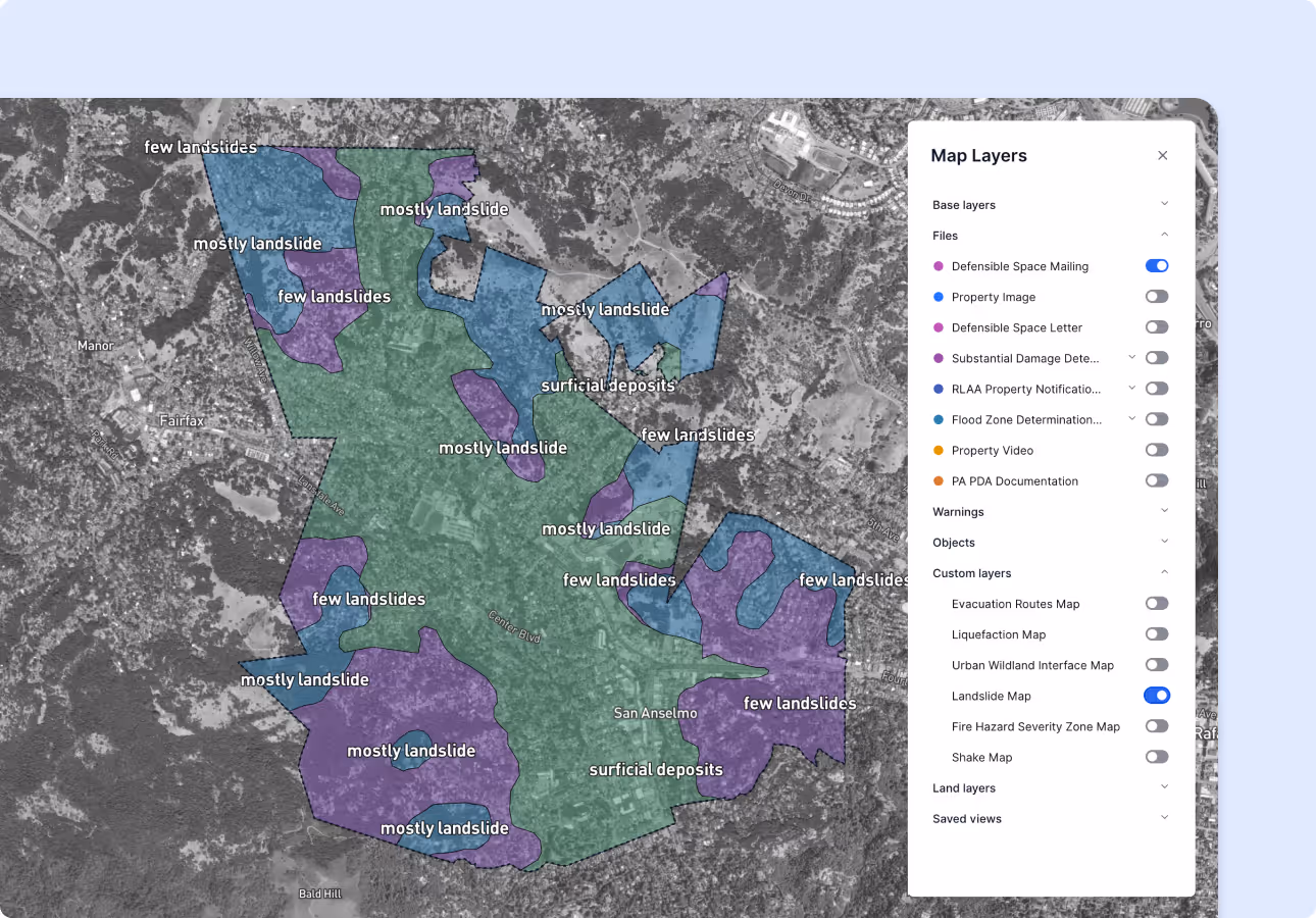 Toggle layers or narrow down views based on zoning, risk areas, or past activity.
